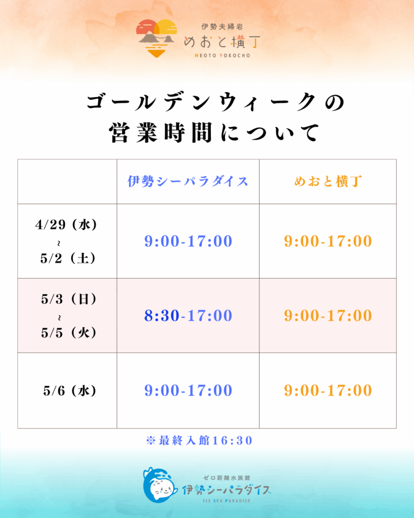 ※5/3(日)~ 5/5(火)は「伊勢シーパラダイス」が8時30分、「めおと横丁」が9時からの営業となりますのでご注意ください。