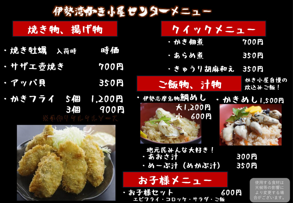 伊勢志摩の素材を活かした「かきめし」や「かき佃煮」、さらに地元で親しまれる「あらめ煮」など、サイドメニューも充実。おひとり一人の好みに合わせて多彩なメニューを堪能できます。